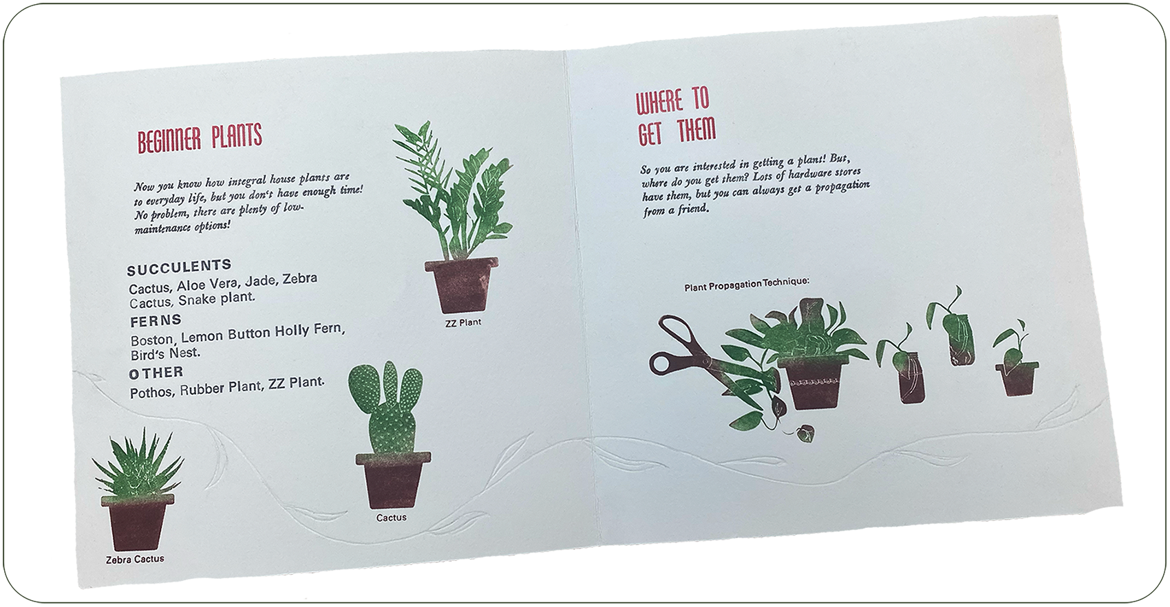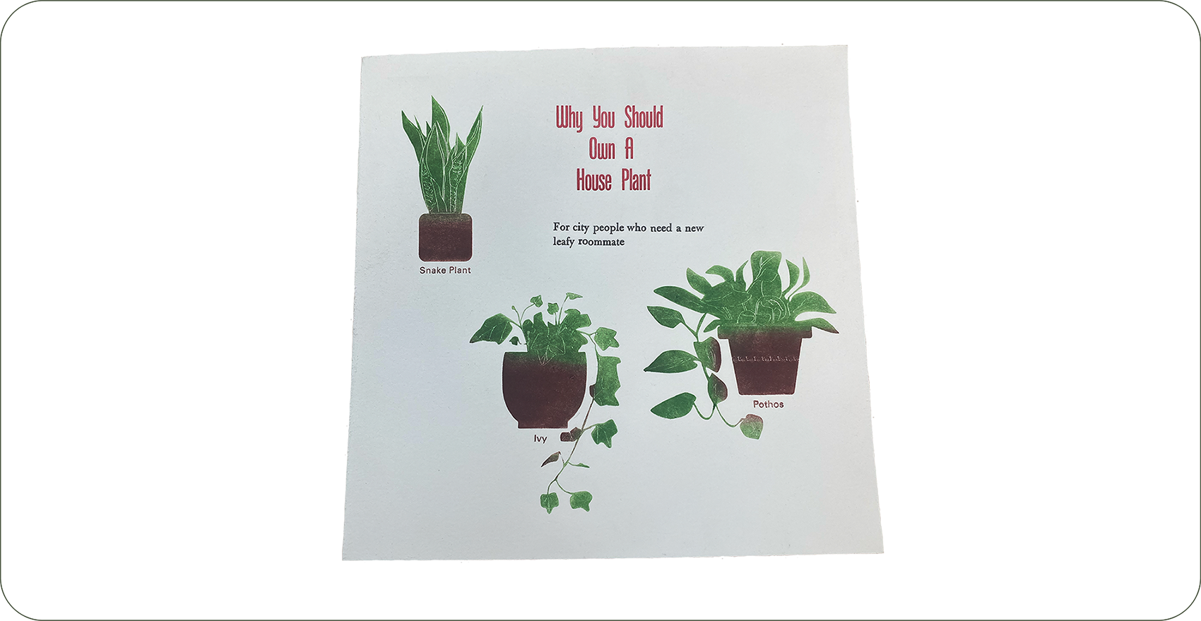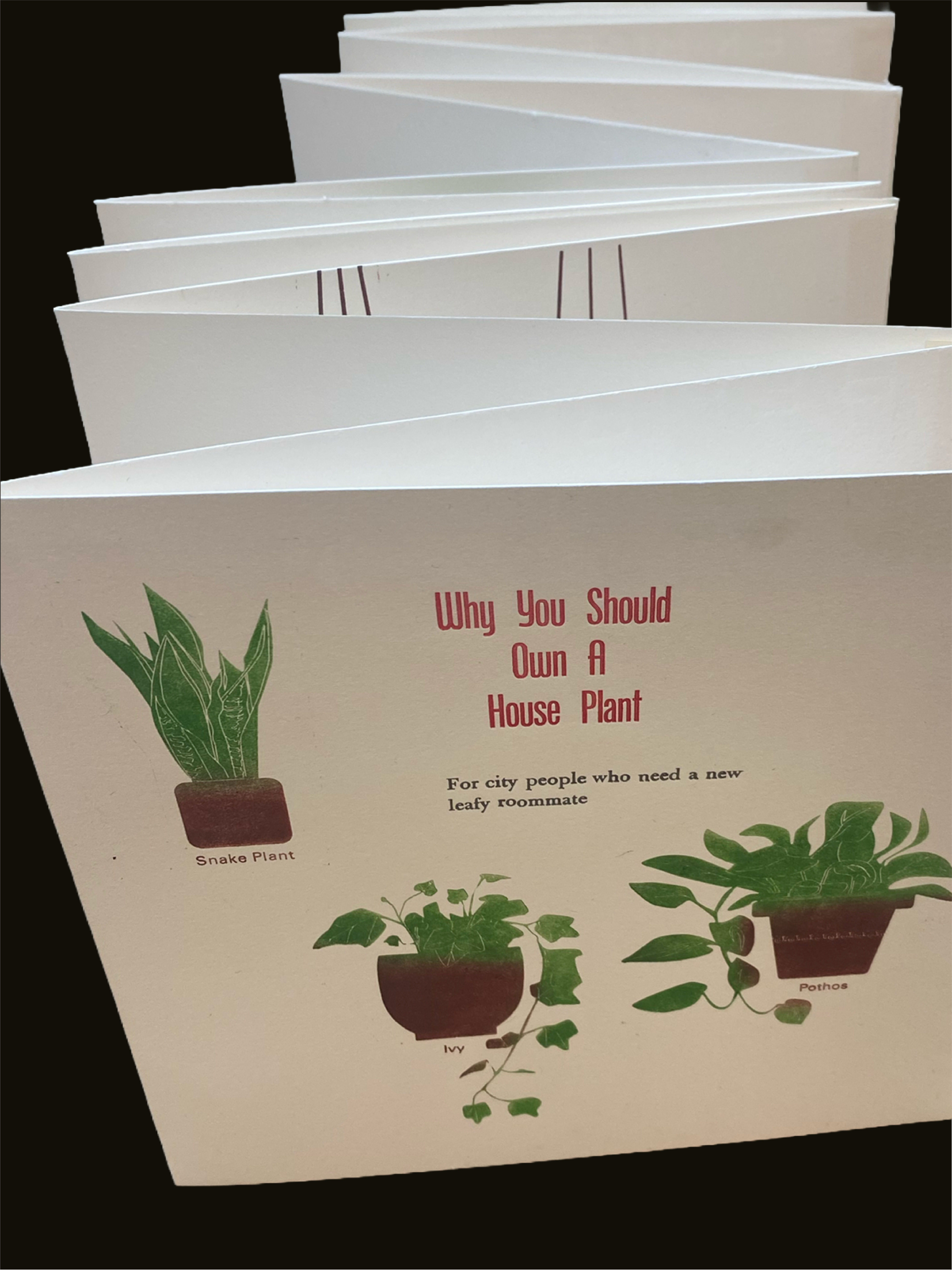 Why You Should Own A House Plant was created to be a fun and tactile way for people living in cities to be more interested in plants. As a plant lover how owns 14 plants (at least), I wanted to show the joys and possibilities of taking care of a plant. The format is an accordion book that can "grow" out to a single long sheet, paired with a heavyweight paper that makes the plants have a unique texture that can be touched. The illustrations were initially created on Adobe Illustrator and then developed on a polymer plate. This became a physical printable thin sheet of plastic that was used to print on the letterpress. Using traditional methods of moveable metal type along with contemporary printing practices on a Vandercook letterpress, this book was completely typeset and printed by hand. This is your sign to go buy a plant! 🪴