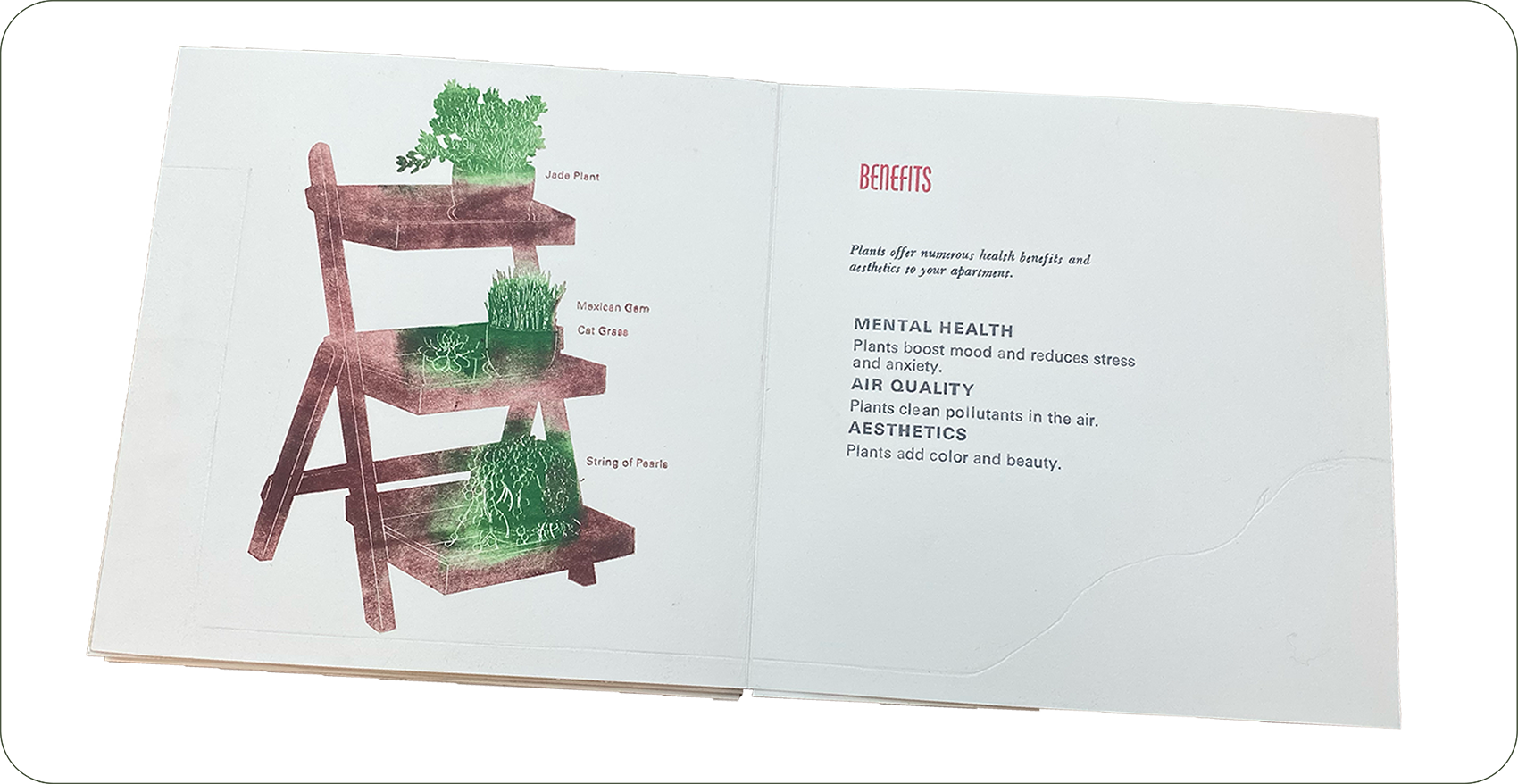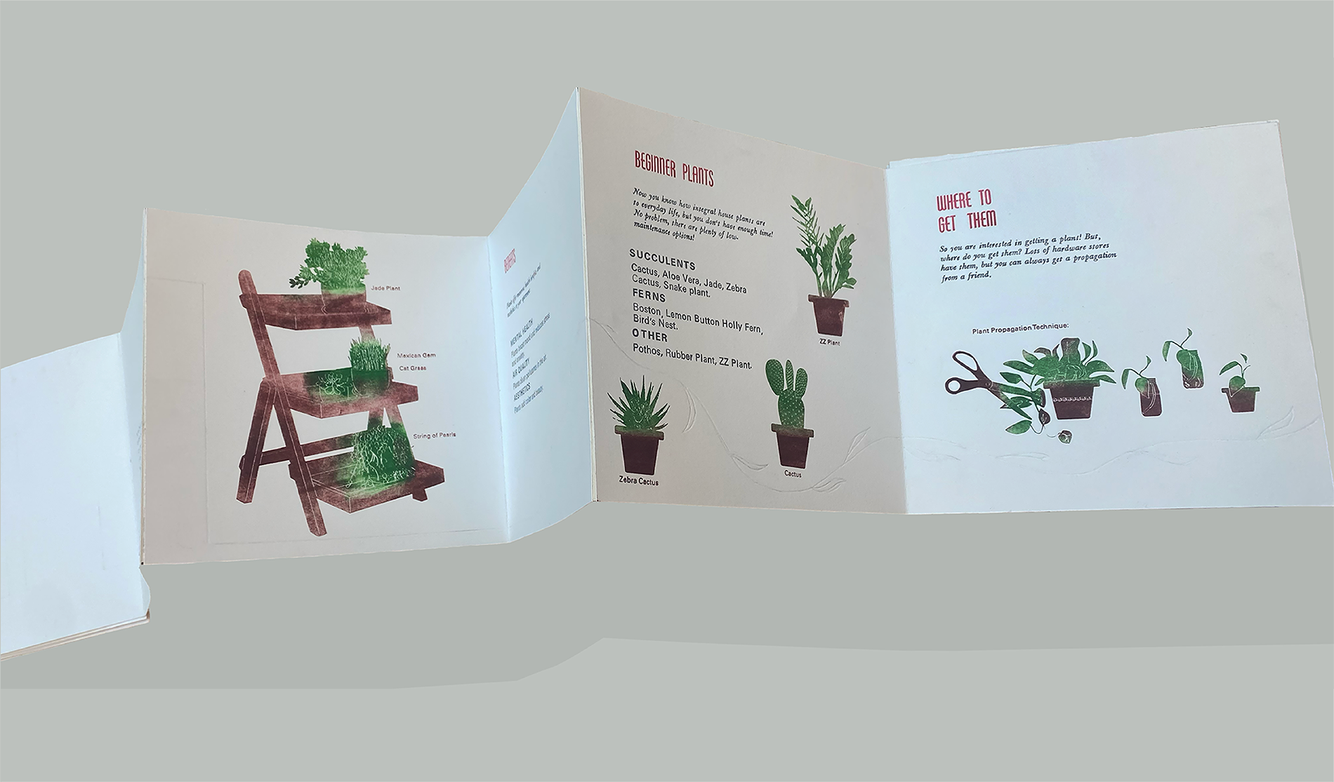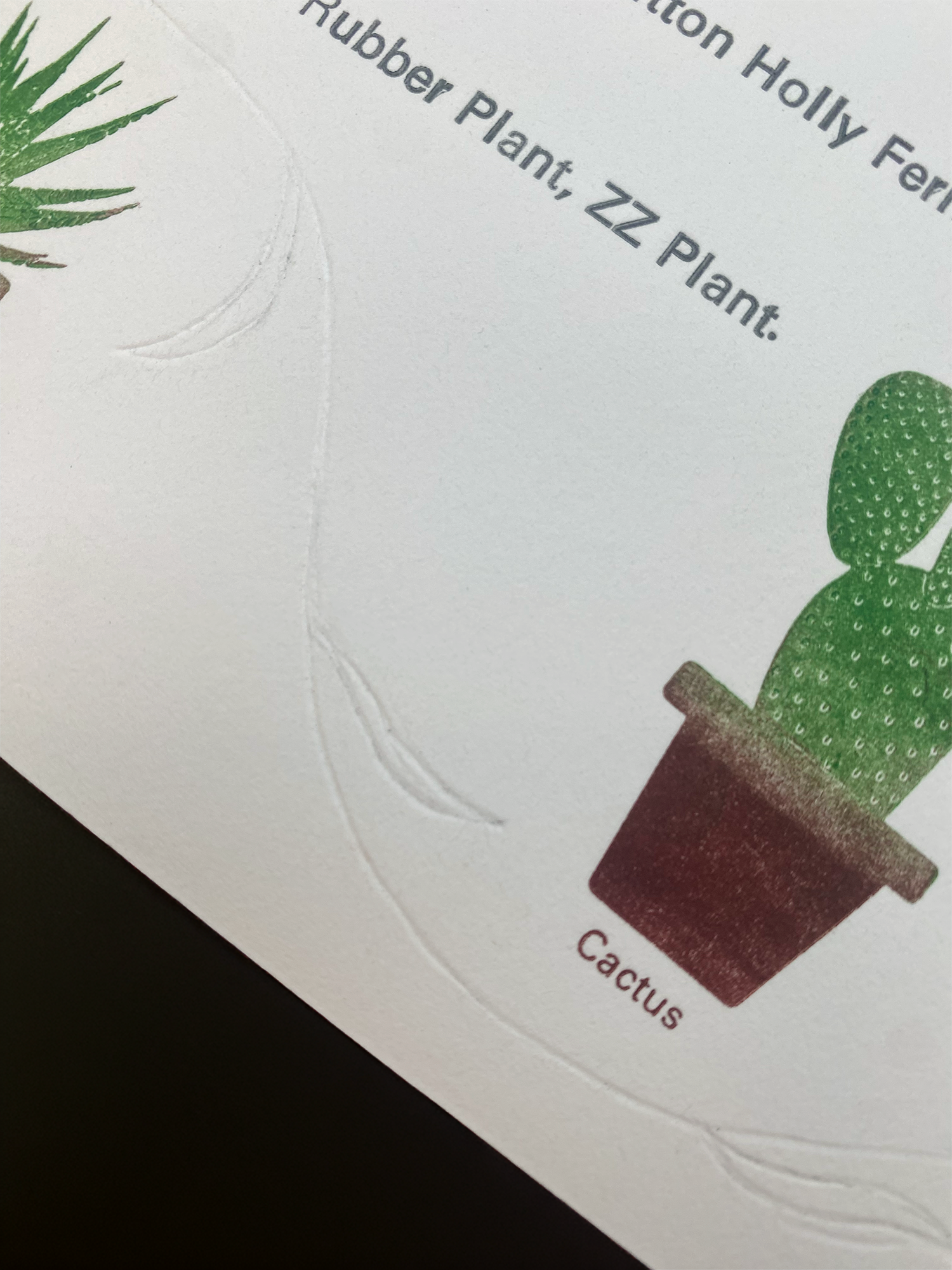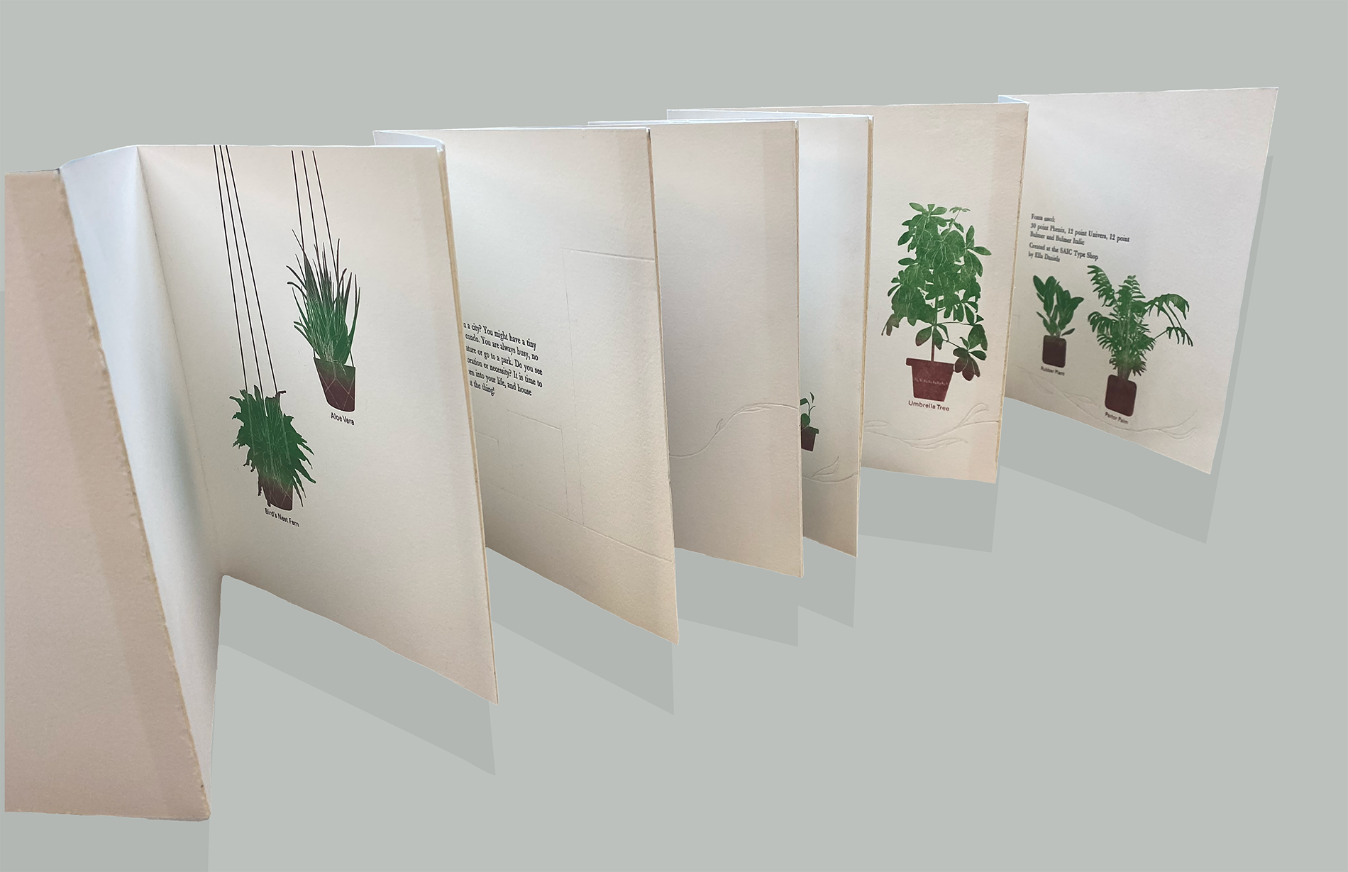 Why You Should Own A House Plant was created to be a fun and tactile way for people living in cities to be more interested in plants. As a plant lover how owns 14 plants (at least), I wanted to show the joys and possibilities of taking care of a plant. The format is an accordion book that can "grow" out to a single long sheet, paired with a heavyweight paper that makes the plants have a unique texture that can be touched. The illustrations were initially created on Adobe Illustrator and then developed on a polymer plate. This became a physical printable thin sheet of plastic that was used to print on the letterpress. Using traditional methods of moveable metal type along with contemporary printing practices on a Vandercook letterpress, this book was completely typeset and printed by hand. This is your sign to go buy a plant! 🪴