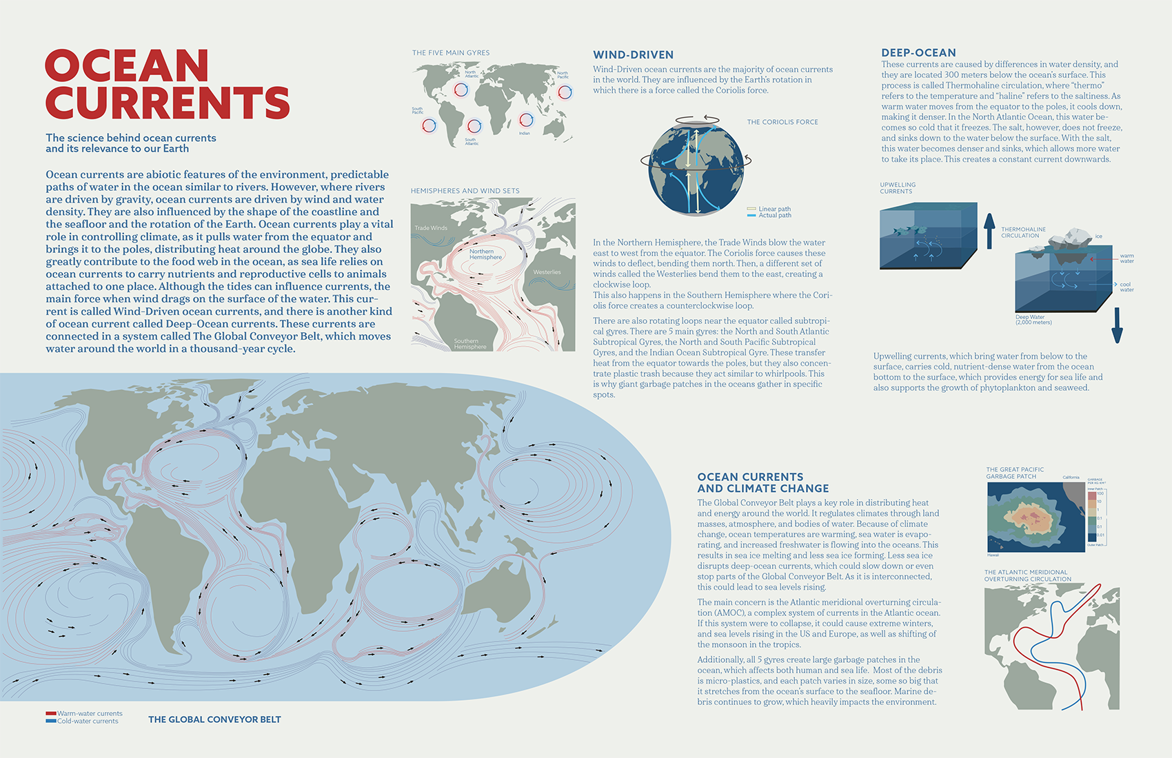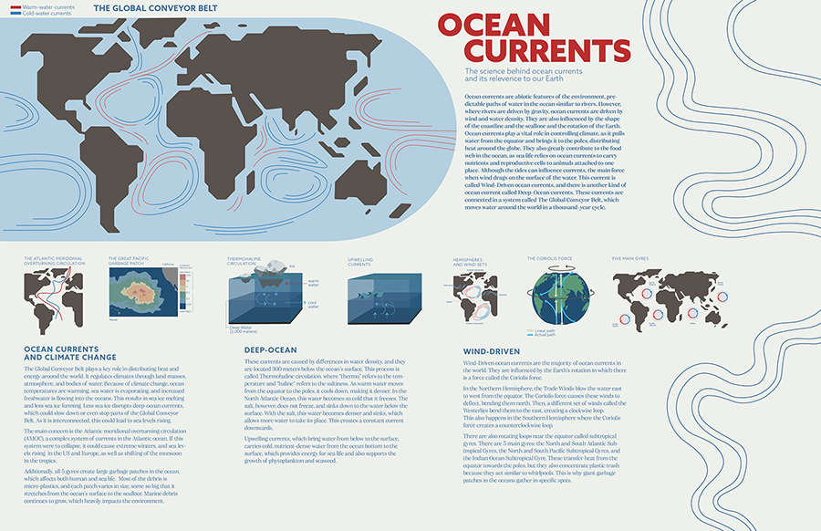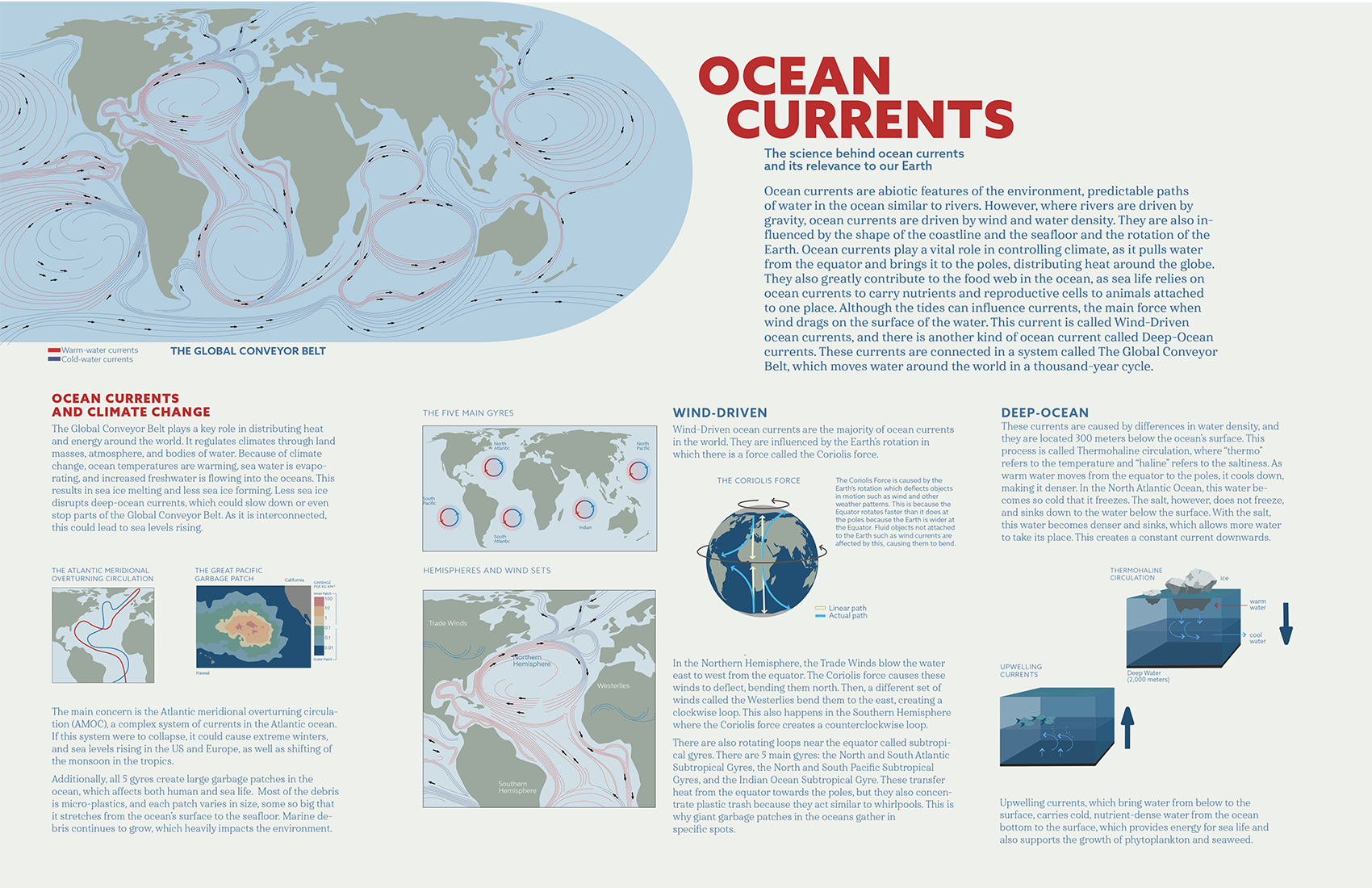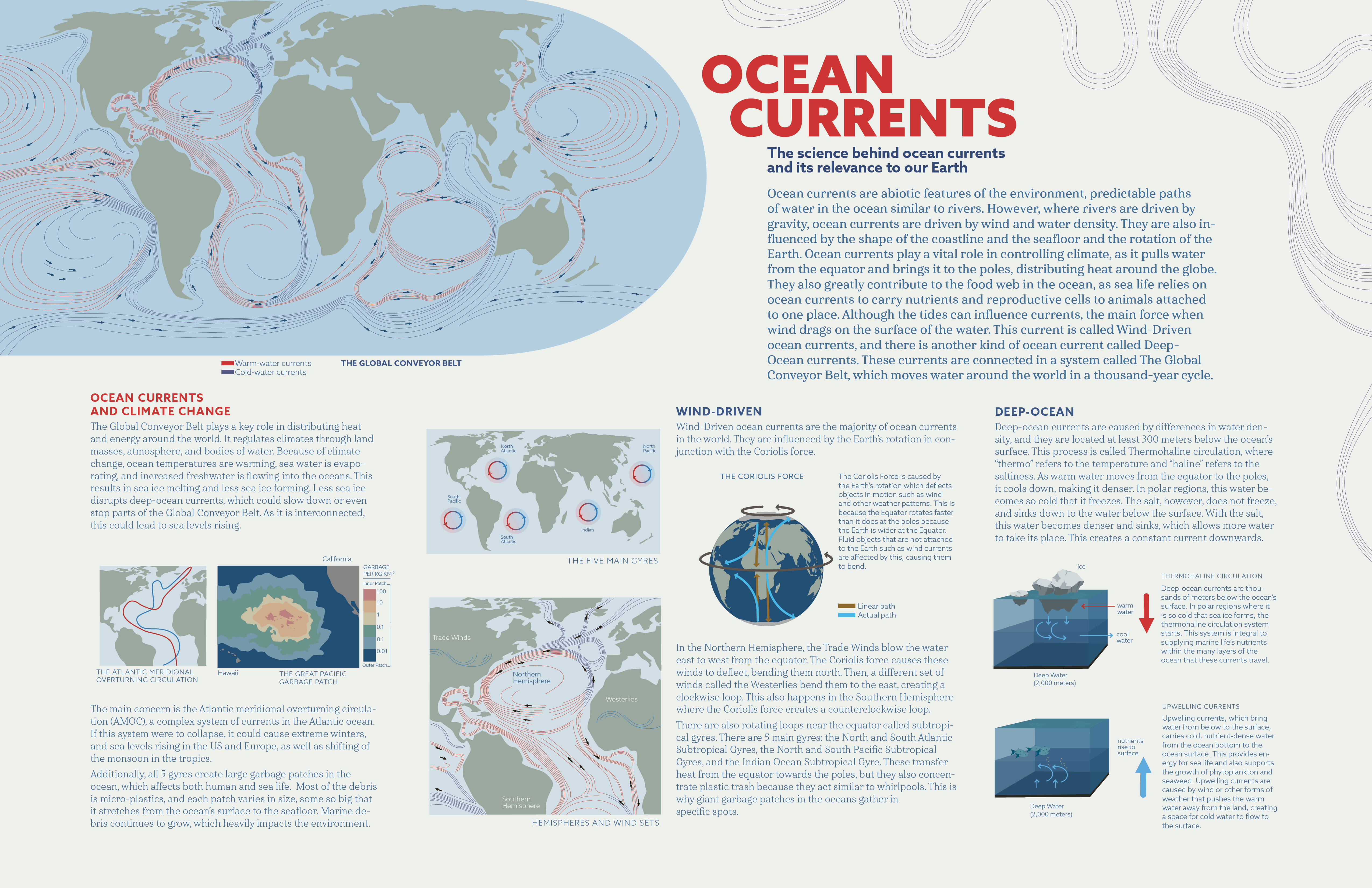 This infographic is designed to educate a general audience about ocean currents, an extremely relevant part of the Earth and its climate. This topic is especially important because as polar ice continues to melt, these circulation systems are at increasing risk. This infographic was created by an in-depth research process including both written and visual sources, illustrationss, and refining multiple drafts. A combination of graphics and text make the infographic more engaging and accessible.