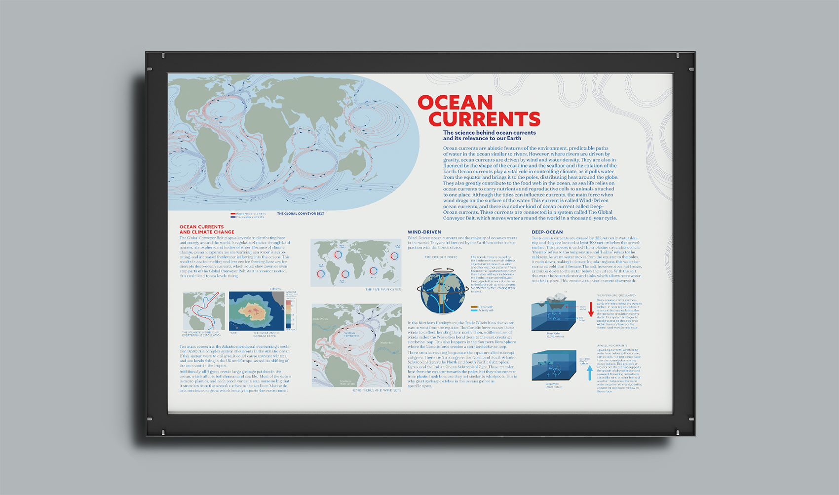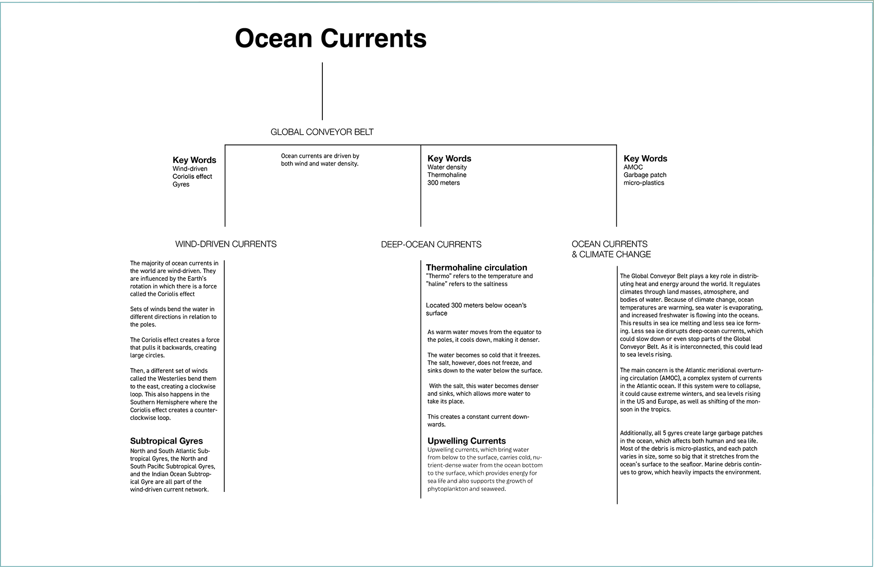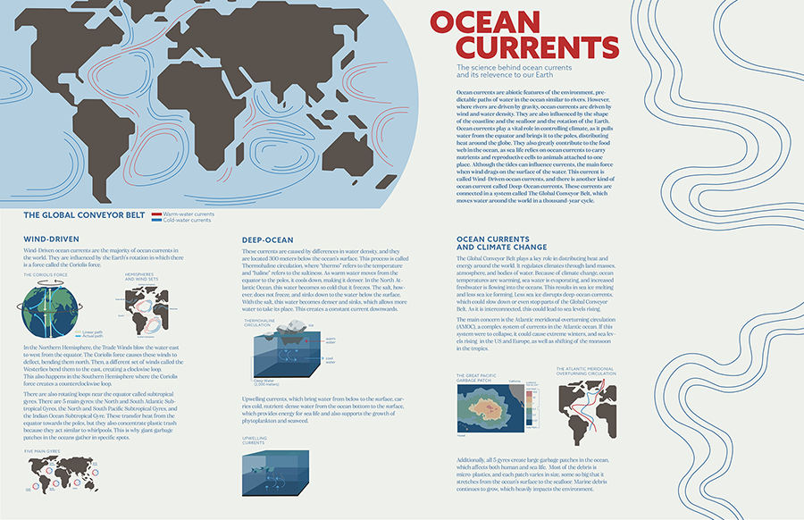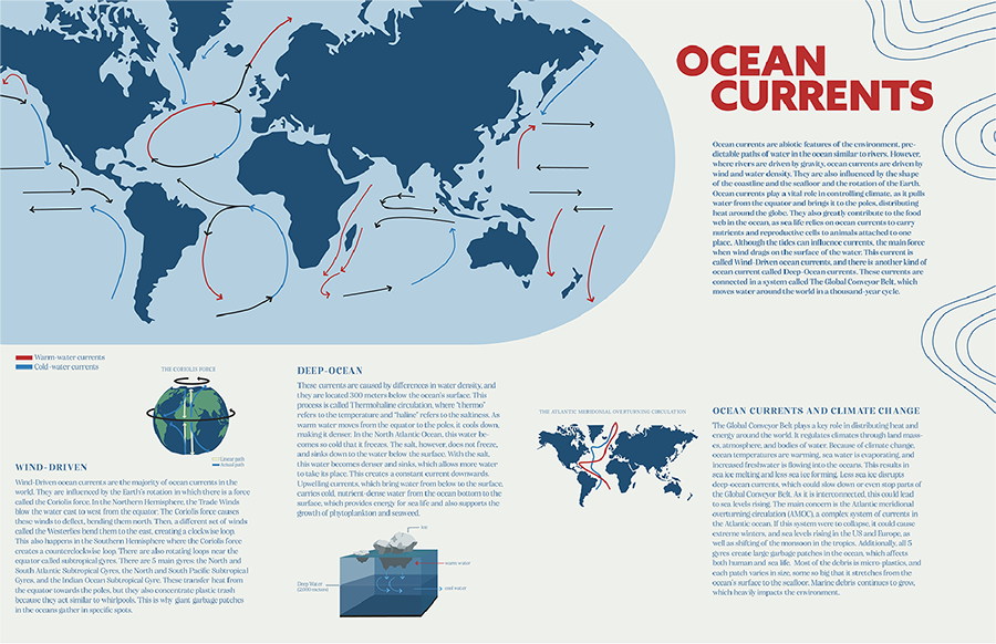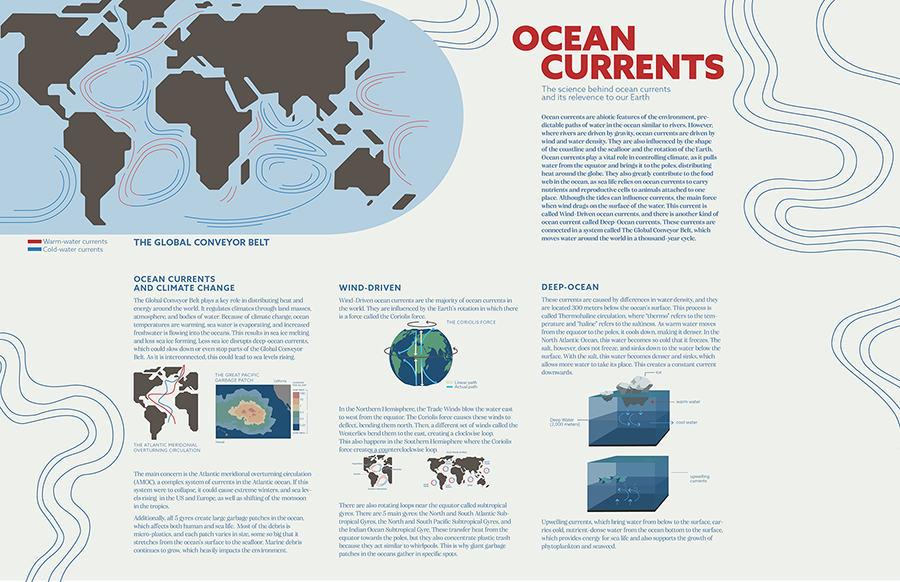 This infographic is designed to educate a general audience about ocean currents, an extremely relevant part of the Earth and its climate. This topic is especially important because as polar ice continues to melt, these circulation systems are at increasing risk. This infographic was created by an in-depth research process including both written and visual sources, illustrationss, and refining multiple drafts. A combination of graphics and text make the infographic more engaging and accessible.
