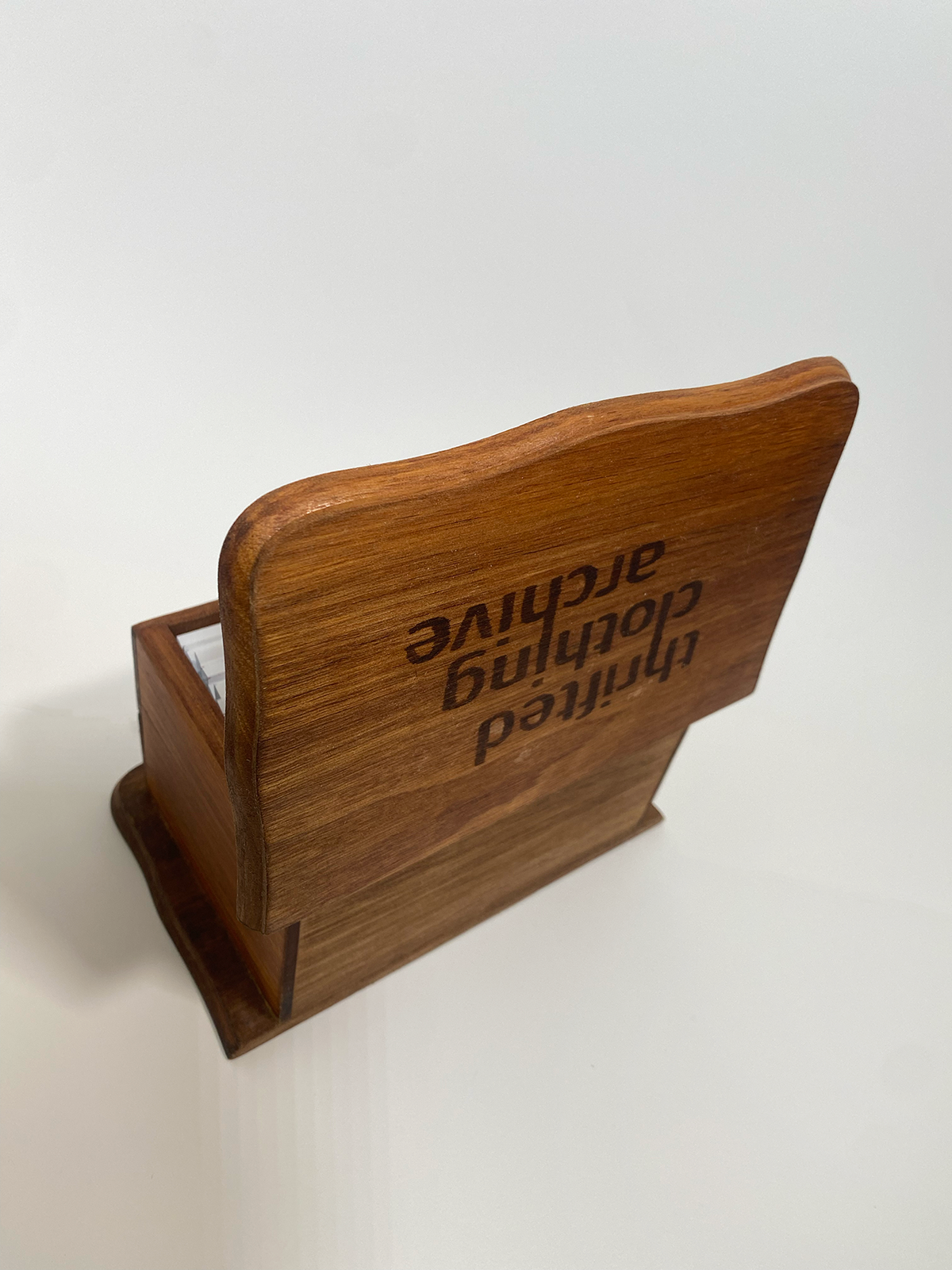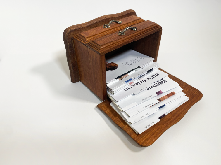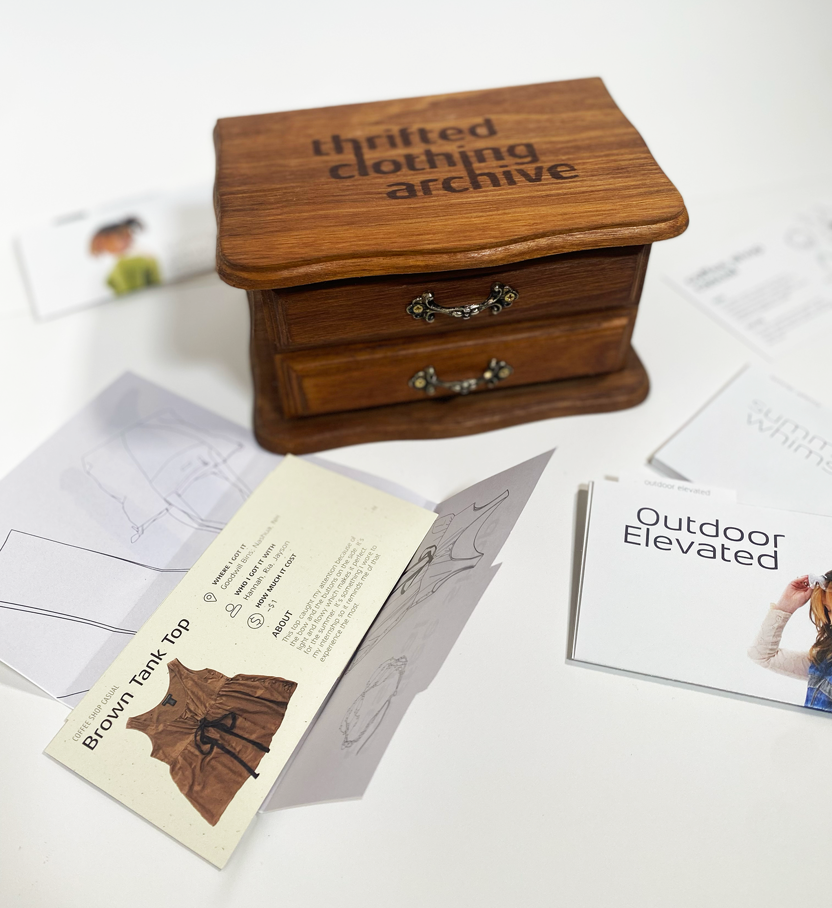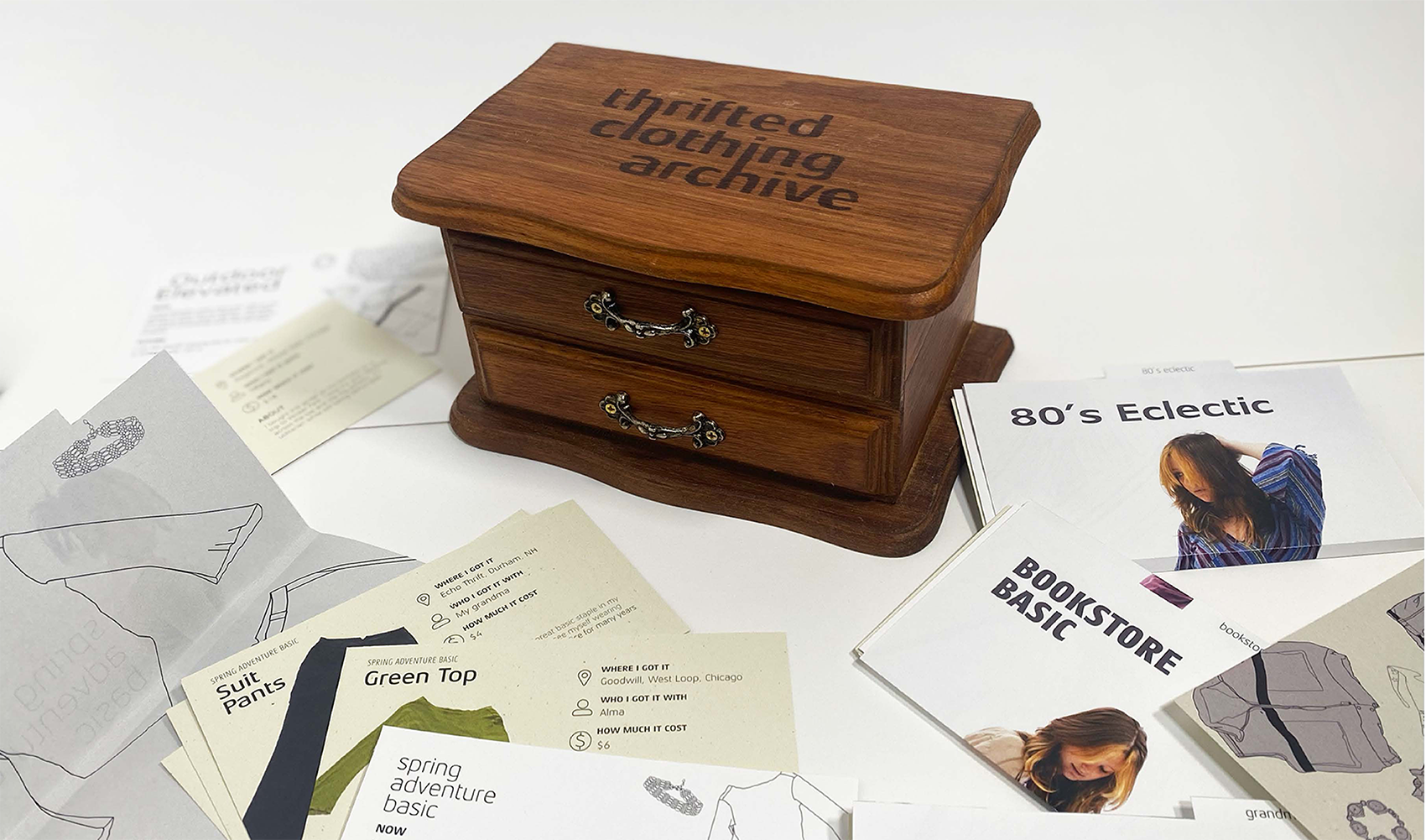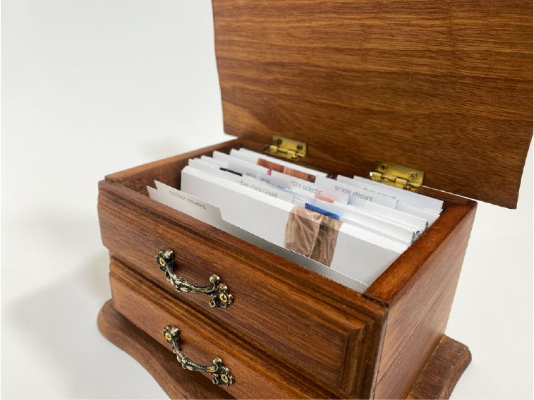 Sparked from my love of thrifting, this clothing archive is a narrative of the different outfits I style. The clothing drawer card holder is inspired from vintage recipe card boxes with a spin on clothing. Within the 10 unique outfit header cards, each item of clothing has its own card describing where I got it, who I got it with, and how I imagine the history of it to be. There are also cards describing the whole outfit and why I wear it and what it reminds me of. The box was also thrifted for this project and was revamped from a jewelry box to an outfit card holder. This involved stripping the varnish from the wood and sanding it down, creating a stencil for the title and filling it in with a marker, and then staining and sealing the wood.