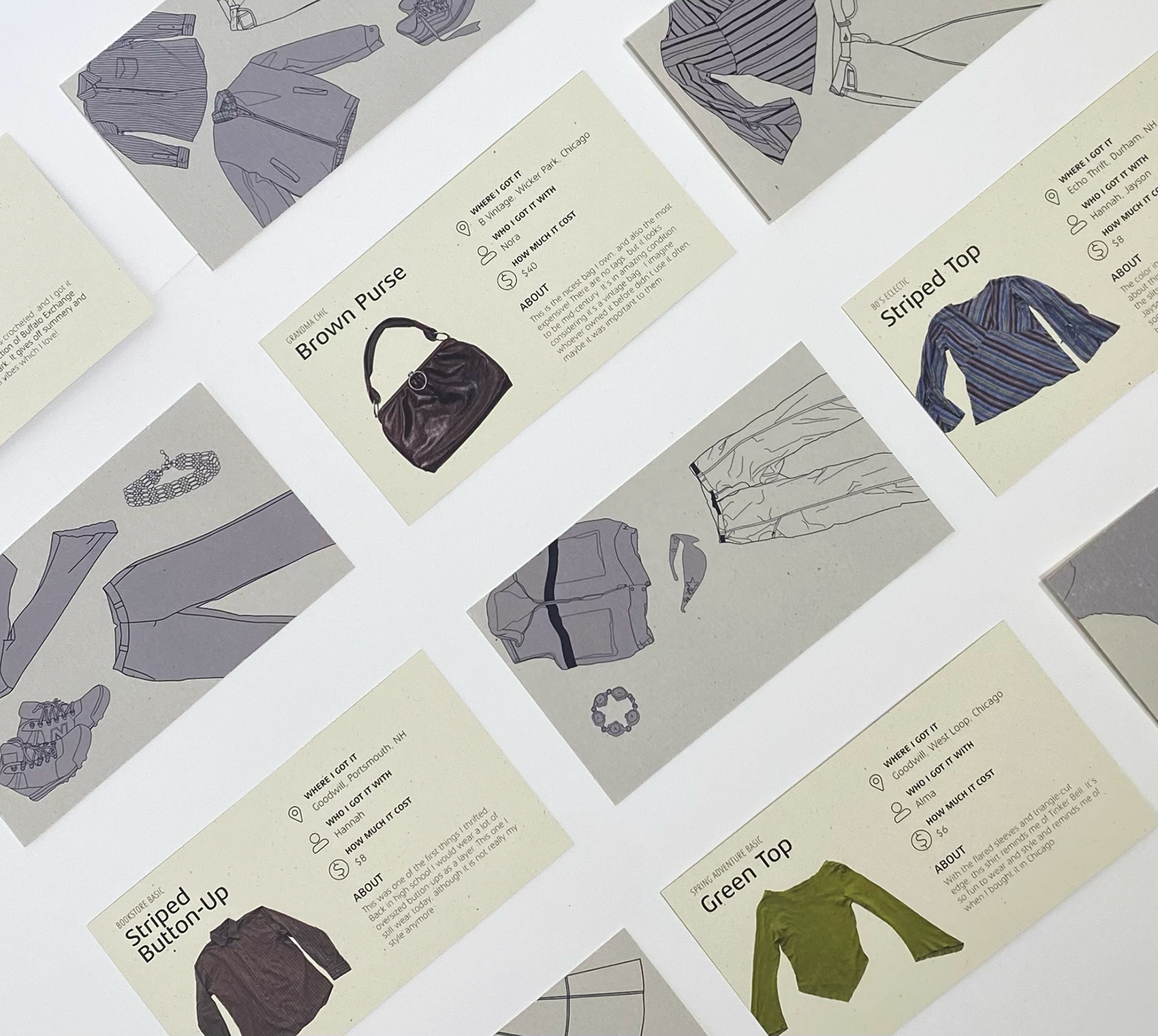 pieces from the entire outfit to easily categorize them, illustrated via Adobe Illustrator. The selected clothing item that the card is describing